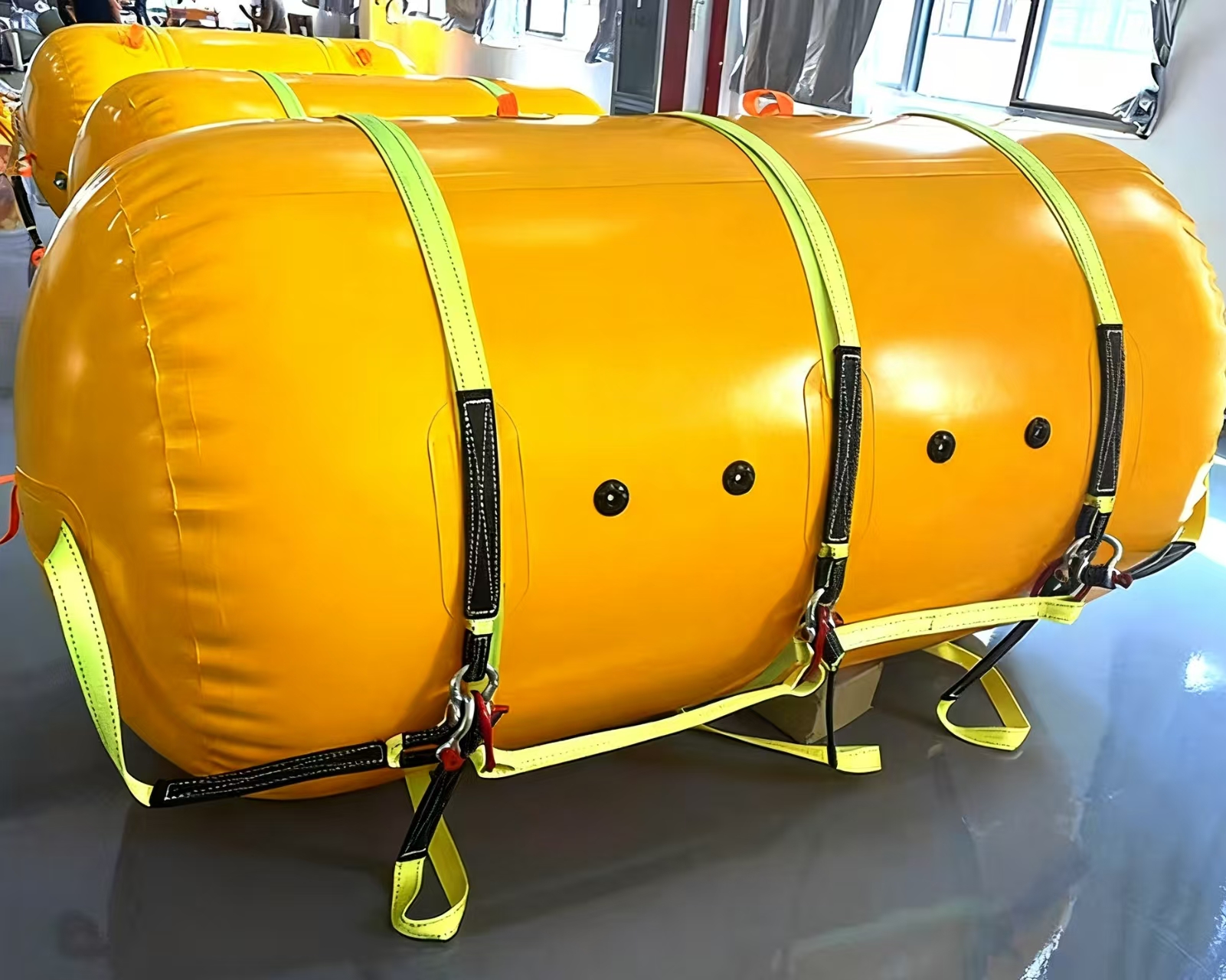 Structural Design: The cylindrical inflatable structure is equipped with multiple sets of fluorescent yellow reinforced straps. This not only enhances the overall load-bearing capacity, but also the professional buckles on the straps enable quick connection and fixation, making the operation convenient and efficient.